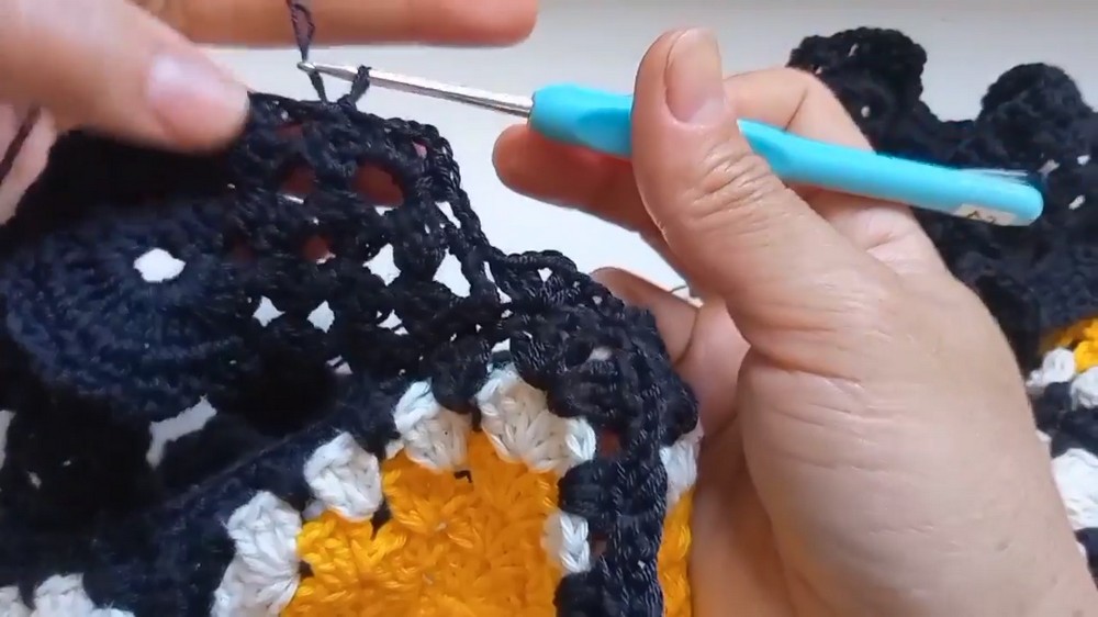 - Follow the stitching pattern used in the first square, continuing with fans and block sections (double crochets).