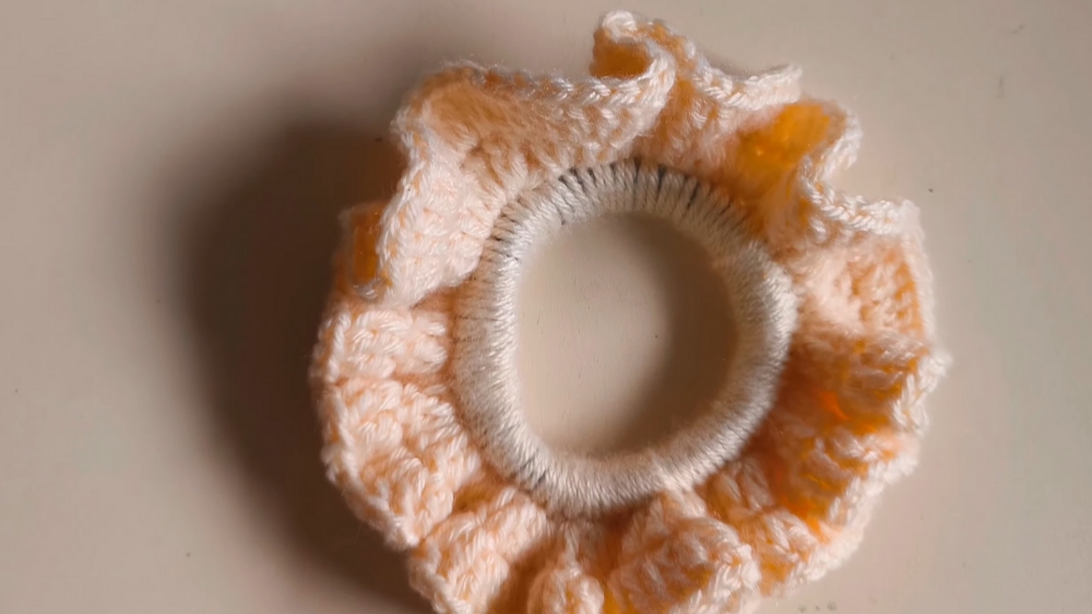 - Work two double crochets in each stitch. This will create the frilled and ruffled effect characteristic of the scrunchie.