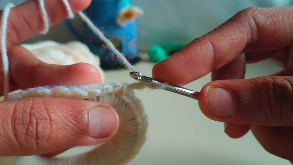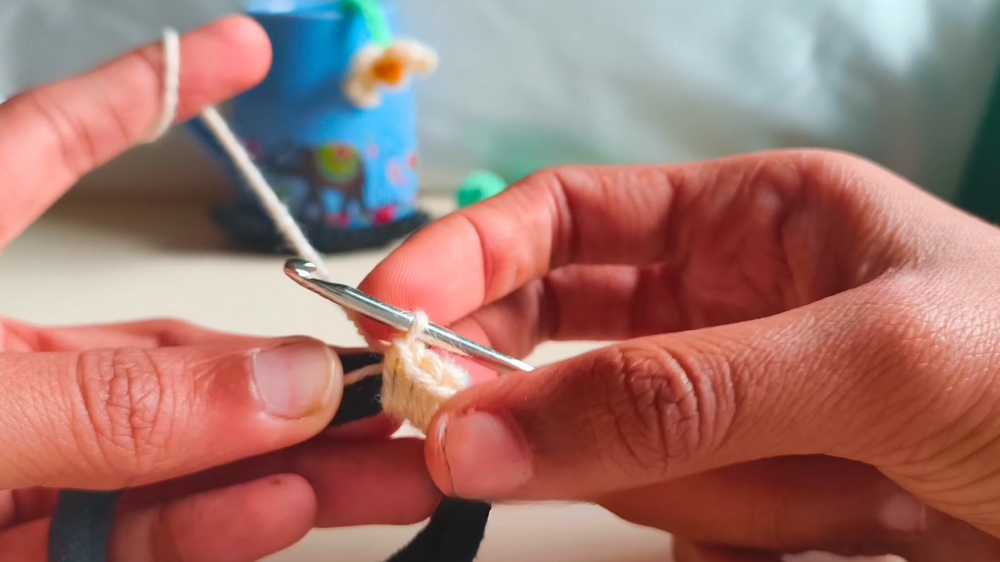 - Continue making single crochets (SC) around the rubber band until it is fully covered.
