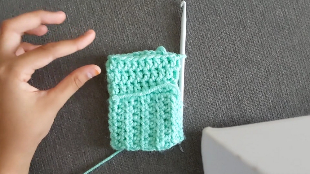 - Chain 1 at the end of the row, turn, and continue until the ribbing wraps comfortably around your wrist. Typically, this requires about 18 rows.