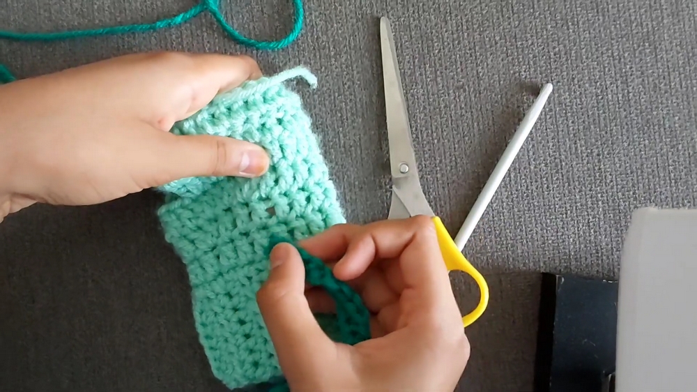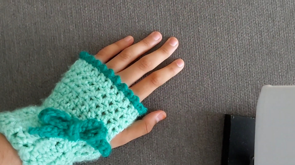 - Once the glove reaches the desired length, cut the yarn and pull it through to secure the final stitch.