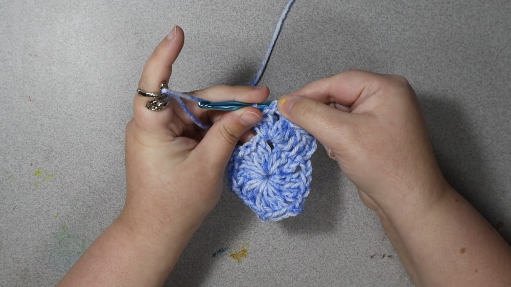 - Ch 3 (counts as first dc), 2 dc in ring, ch 2 (first corner).