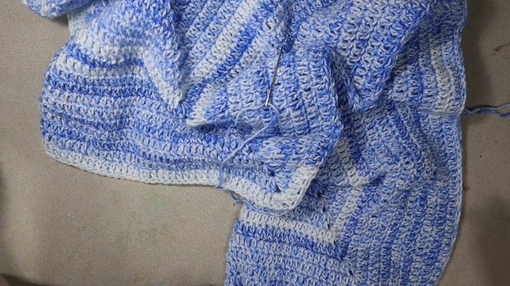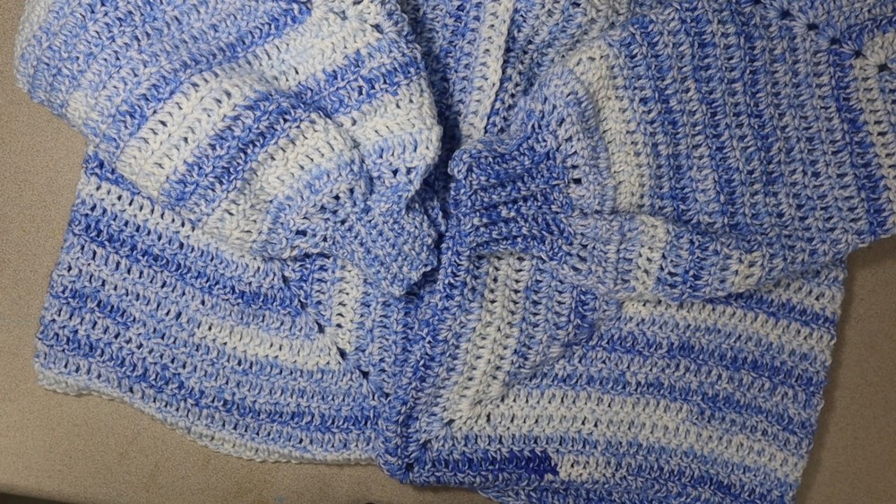 - Two hexagon panels are crocheted and sewn together for this cardigan.