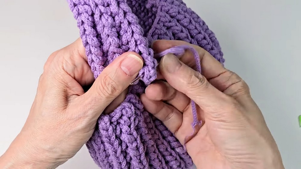 Toward the end, the handles are incorporated by chaining stitches and skipping spaces, then reinforced for durability using tighter stitch combinations. This step secures the handles, ensuring they remain strong even with heavier loads.