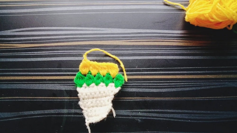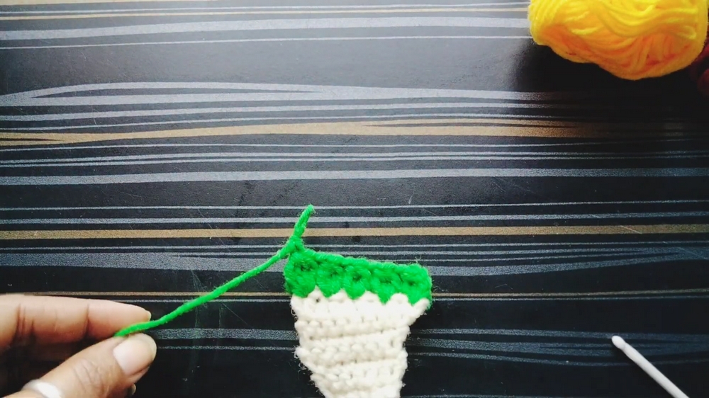 - Repeat this process for 2 more rows, maintaining a total stitch count of 7 per row.