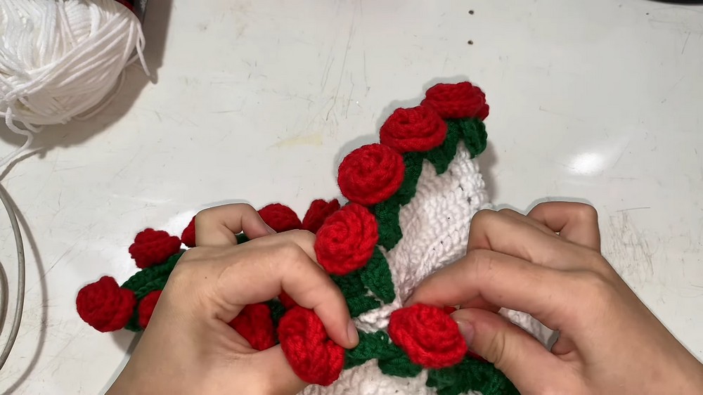 Once the main body is complete, the rose embellishments come into play—crocheted separately or incorporated directly on the bag using layering methods for a dimensional floral effect.