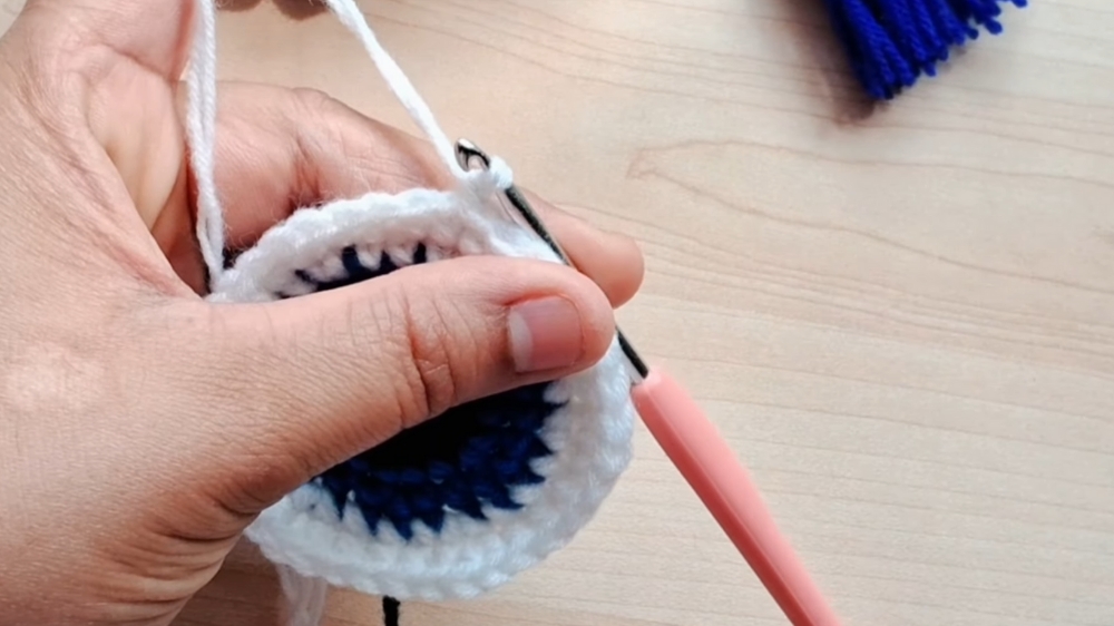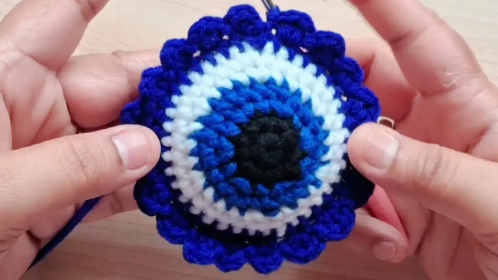 The second round further enlarges the circle using careful increases, resulting in 12 neat black stitches. Transitioning into softer tones, the light blue thread is added in the third round to frame the pupil attractively. This gradual layering of colors continues with white and dark blue in subsequent rows, creating a harmonious gradient that complements the symbolic nature of the piece.