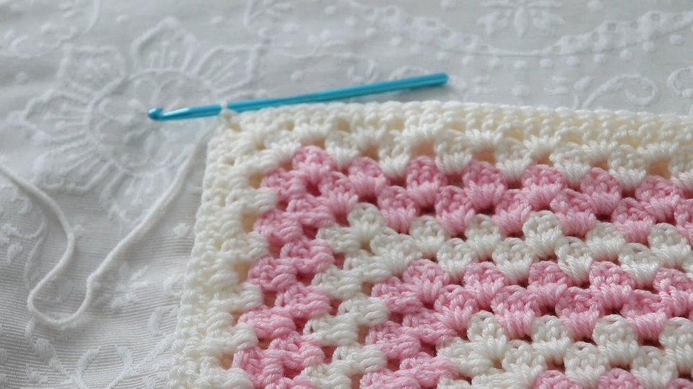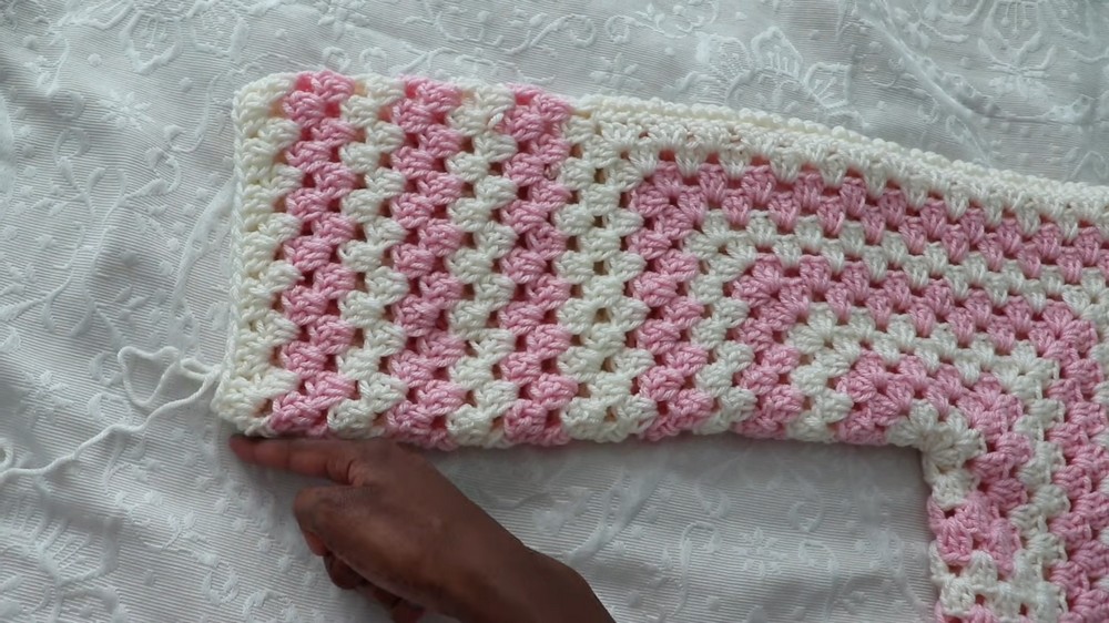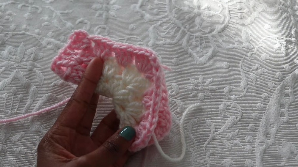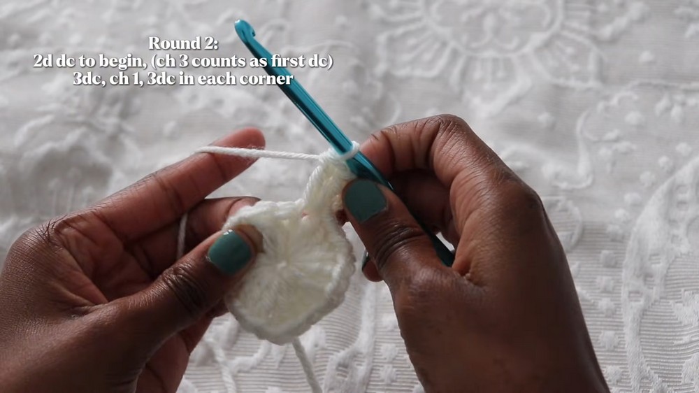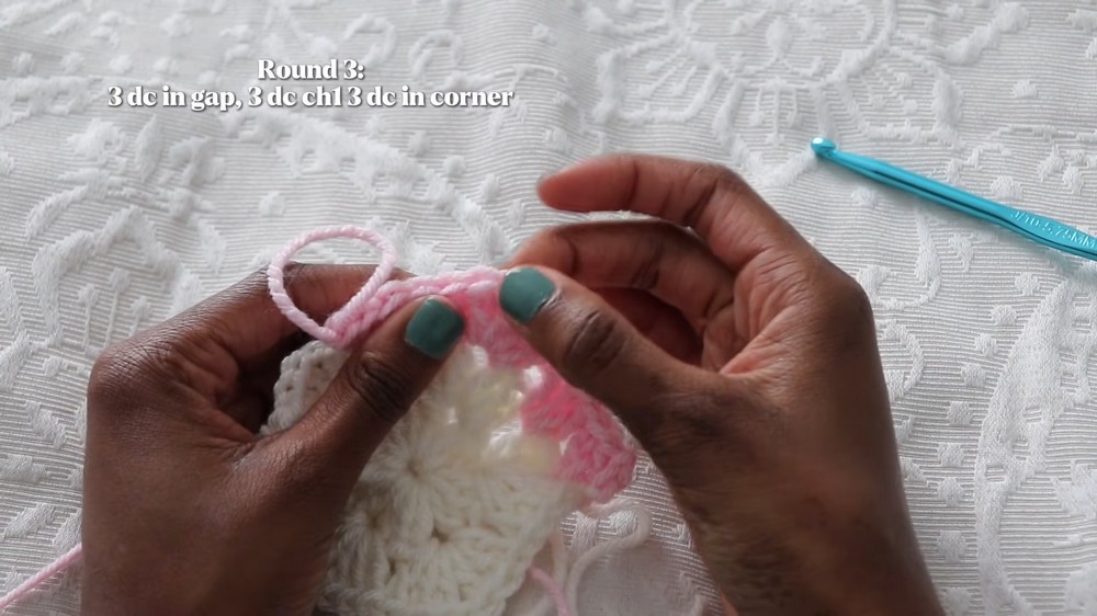- Continue: Work (3 dc, ch 1, 3 dc) in each corner; (3 dc) in each side space.