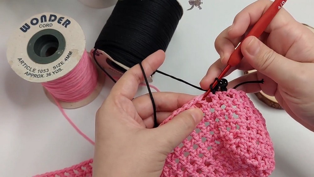 The pattern is repeated in rounds until the bag reaches the desired height. If you’d like a wider base, simply add more rows before transitioning. For a professional look, secure the ends of nylon cords with a lighter to prevent fraying.