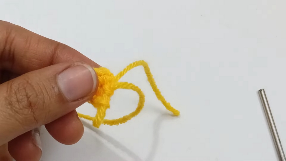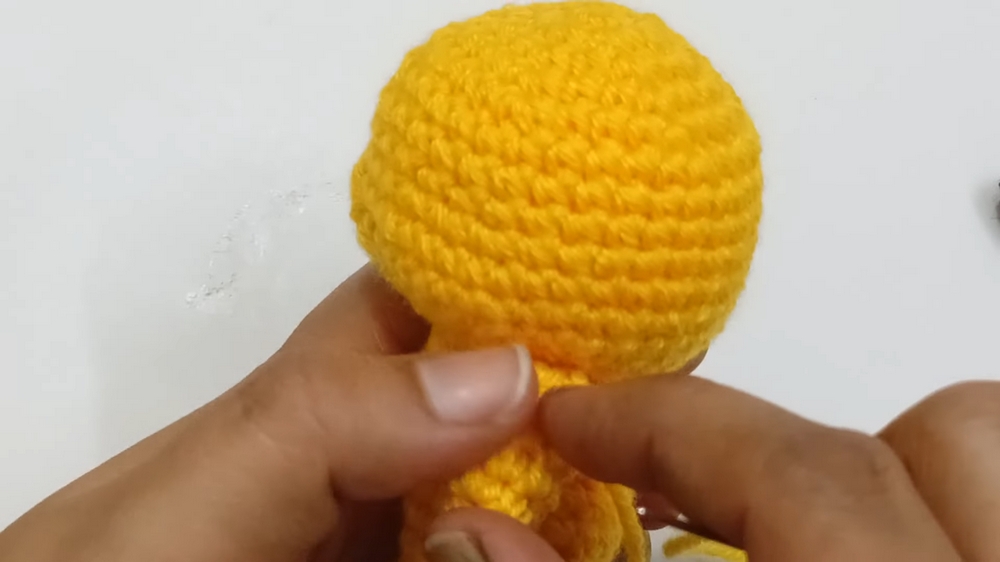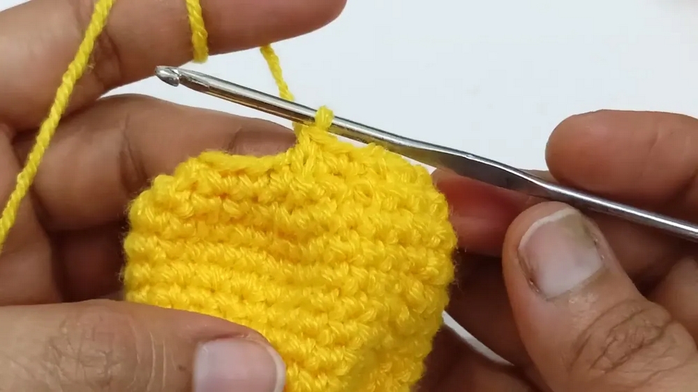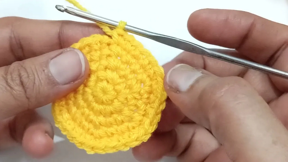 - Start with a magic ring with 4 SC in the first round, increase to 6, and then switch to yellow yarn after 3 rounds.