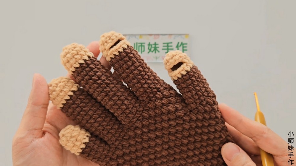 As you proceed, separate sections are created for the fingers, with each one shaped individually using techniques such as single, half-double, or double crochet stitches.