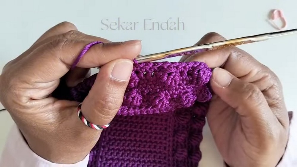 - Repeat the pattern: 3 single crochets followed by 1 bubble stitch.