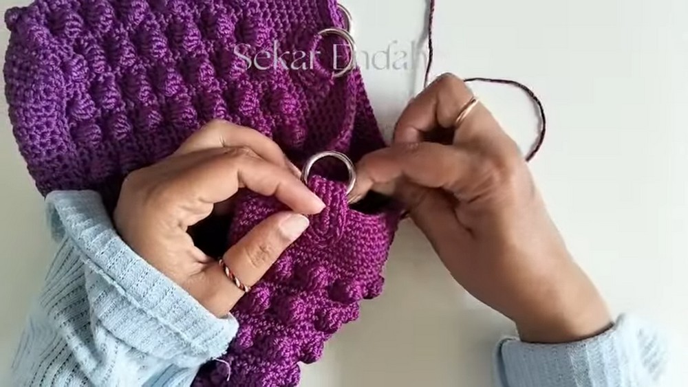- Use round rings for joining handles and add 9 single crochets to them using a similar method.