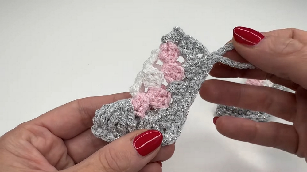 - Use single crochet stitches to join one side of the square. Start from the toe, and work along one edge, ensuring both sides are stitched together.