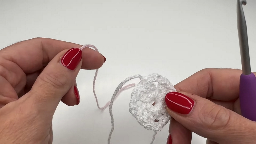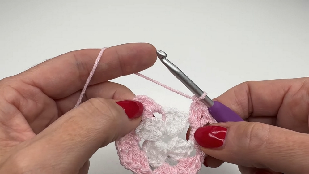 - Change to a new color and attach the yarn to any of the chain-2 spaces from Round 1.