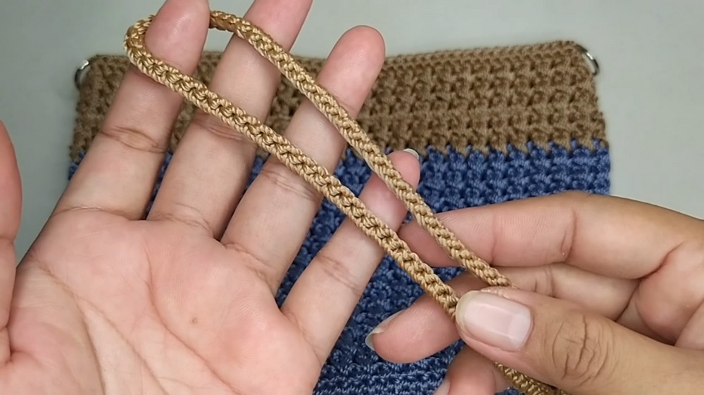 - Once there, attach the D-ring and secure it with single crochets. Repeat on the other side.