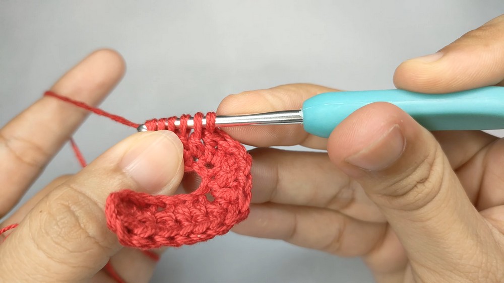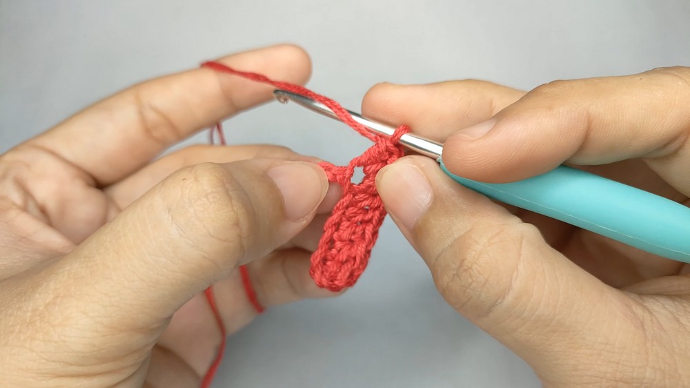 - Yarn over and insert the hook back into the same chain to create the second double crochet.