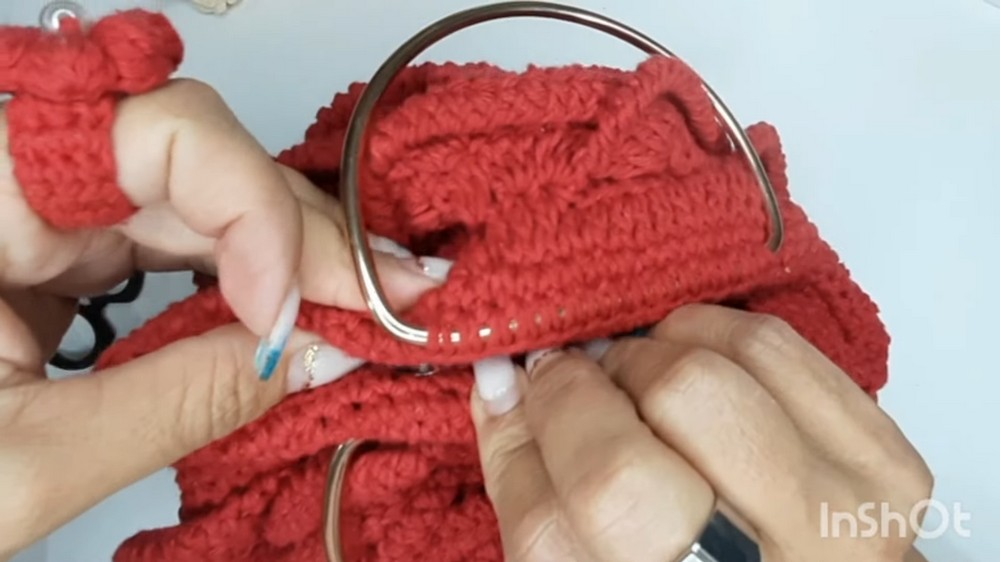 - Take the chain strap/handle; hold in place on the bag to mark your 15 sc attachment points.