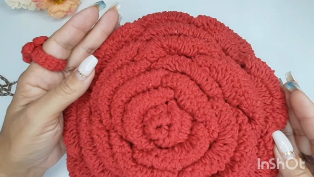 - The bag is worked bottom-up, starting with a round base and expanding petals.