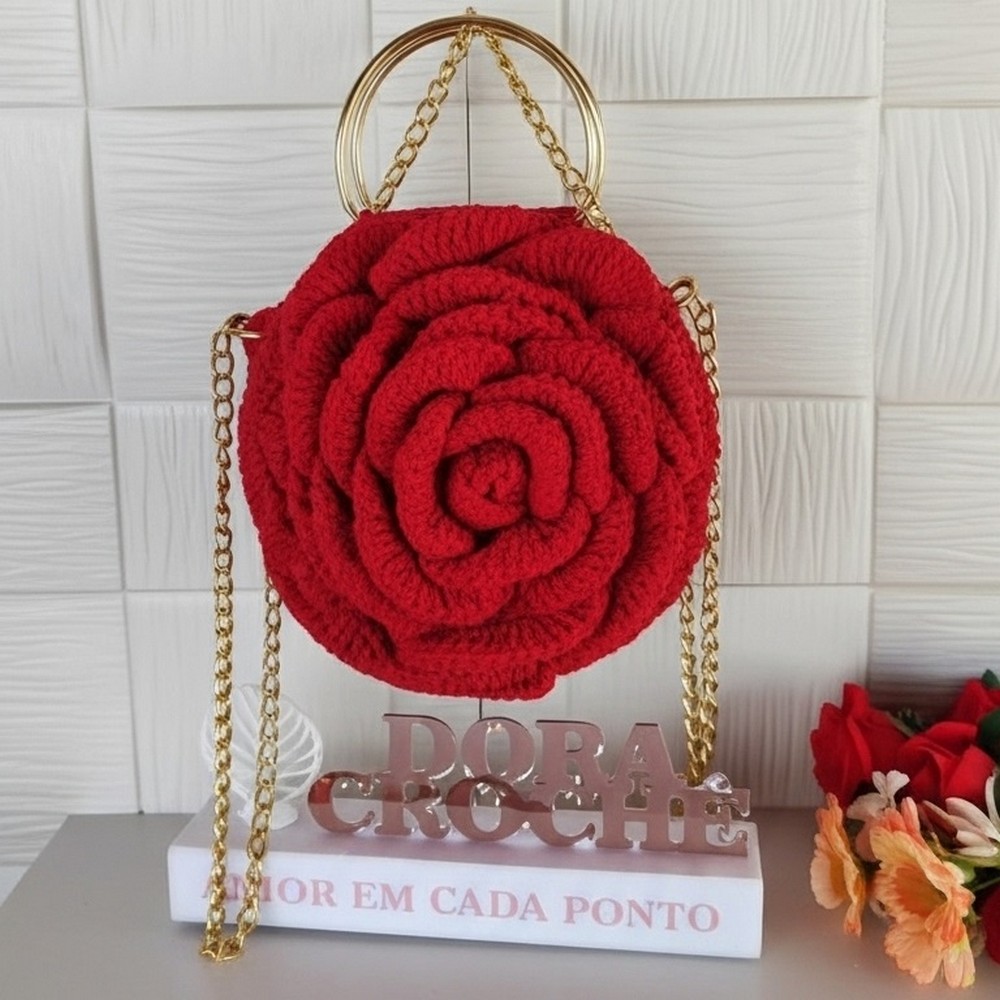 This elegant floral-petal bag features a sturdy, reinforced open top and a removable metal chain handle. Lining is highly recommended for best shape and strength. The size can be adapted using thicker yarn (No. 8 or nautical rope) or by increasing the number of base stitches/rounds.