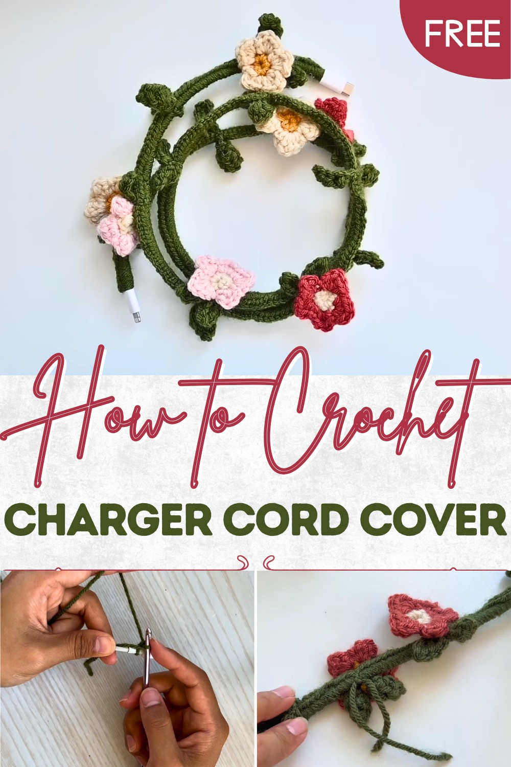- Start: Select the green yarn for the vine. Create a loop and insert your charger cable into the loop.