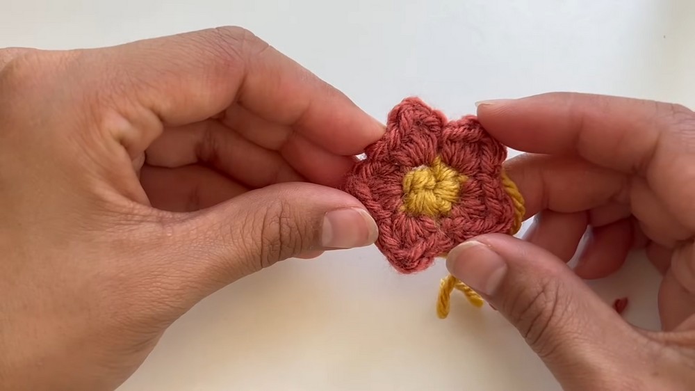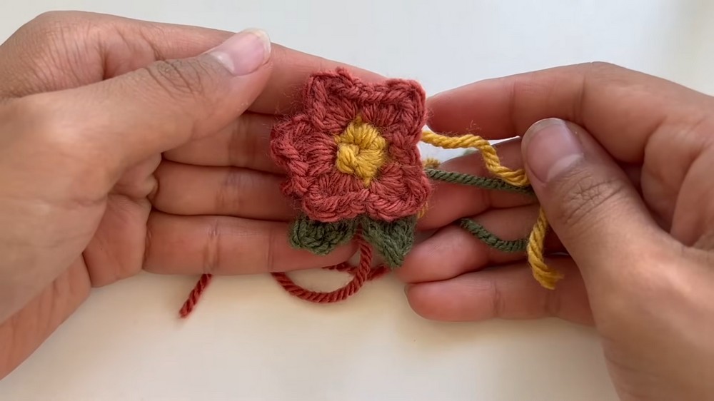 - Start the Flower: Use yellow yarn (or your preferred flower center color) to chain 4 and slip stitch into the first chain to form a loop.