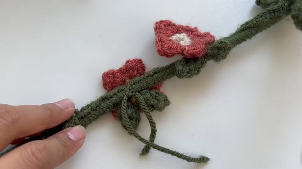 - Attach to Cable: Use the remaining yarn tails to secure the leaves and flowers to the vine-covered cable. Tie them in place and weave in any excess ends.