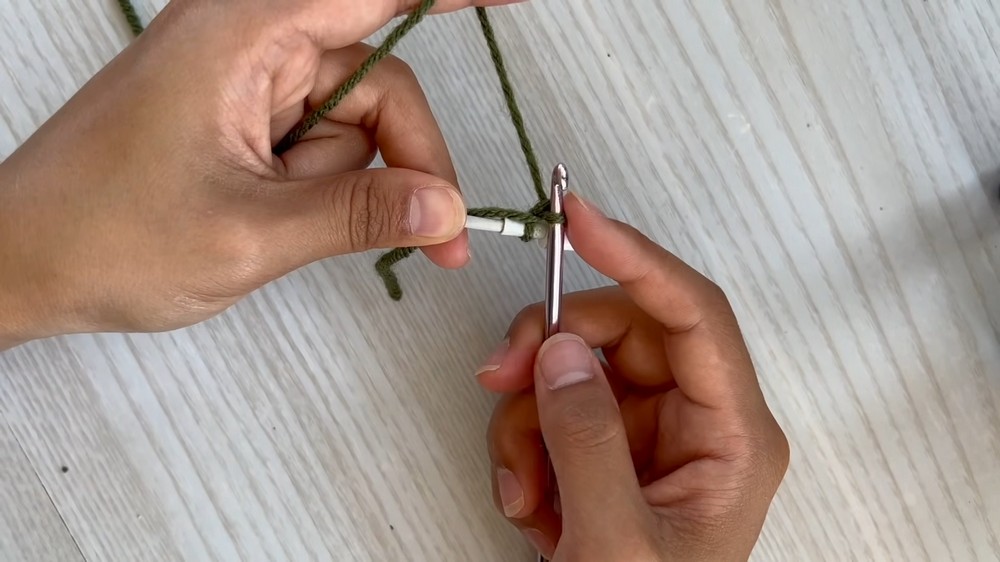 - Start a Chain: Using green yarn, make a loop, chain 4, and skip the first chain.