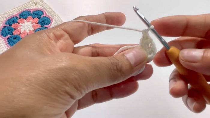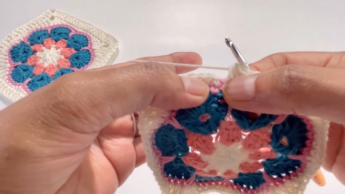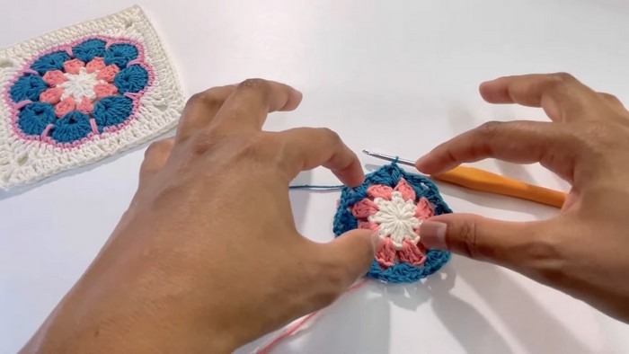As you progress, this circle transforms into a well-defined, symmetrical square, framing the flower in a classic, boxy dimension, making it perfect for joining with other squares in larger projects.