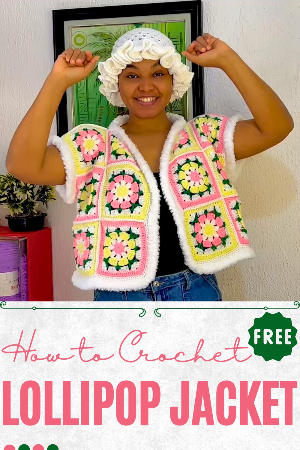 The tutorial provided follows a detailed step-by-step crochet guide for making a vibrant and stylish “Lollipop Jacket.” The design is inspired by lollipop colors, blending bright pinks, whites, greens, and yellows into creative granny squares.