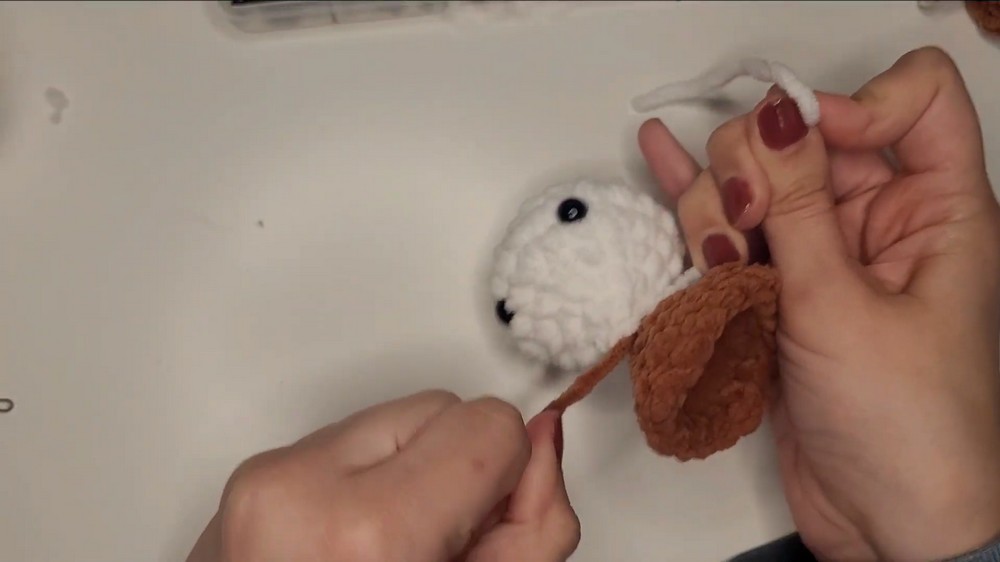 - Safety eyes placement: Test placement by putting the mushroom cap on the body for alignment.